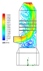 圖9為導(dǎo)流環(huán)邊長(zhǎng)300mm時(shí)吸收塔內(nèi)流線分布。當(dāng)導(dǎo)流板覆蓋率為10.1%時(shí),導(dǎo)流板的擾流效果明顯,貼壁面流線速度接近為零。